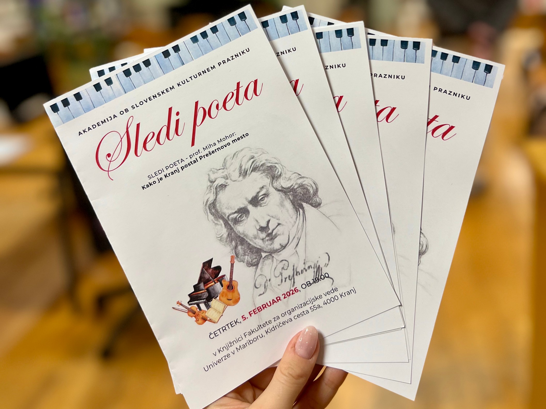 Včeraj, 5. februarja 2026, smo se na Fakulteti za organizacijske vede UM, v sklopu Akademije ob slovenskem kulturnem prazniku – Sledi poeta, poklonili našemu največjemu pesniku Francetu Prešernu.
