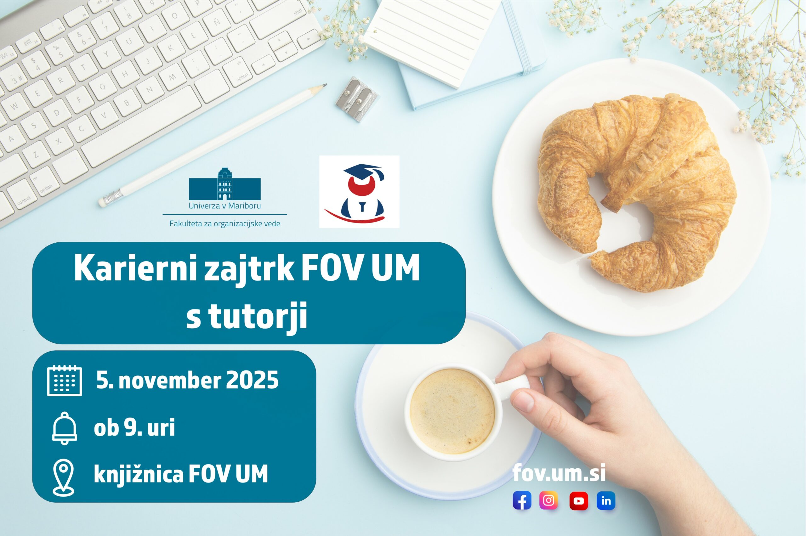 V prostorih knjižnice Fakultete za organizacijske vede UM bo v sredo, 5. novembra 2025, ob 9. uri, potekal Karierni zajtrk FOV UM s tutorji.