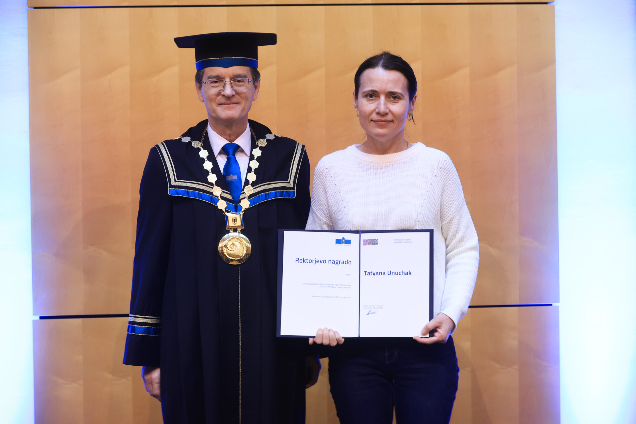 Rektorjevo nagrado Univerze v Mariboru je prejela Tatyana Unuchak, najboljša študentka Fakultete za organizacijske vede v svoji generaciji, ki je julija 2025 pod mentorstvom red. prof. dr. Mirjane Kljajić Borštnar na podiplomskem študijskem programu Organizacija in management informacijskih sistemov uspešno zagovarjala magistrsko nalogo z naslovom Uporaba metod strojnega učenja za izboljšanje procesa vodenja nalog pri projektnih dejavnostih.