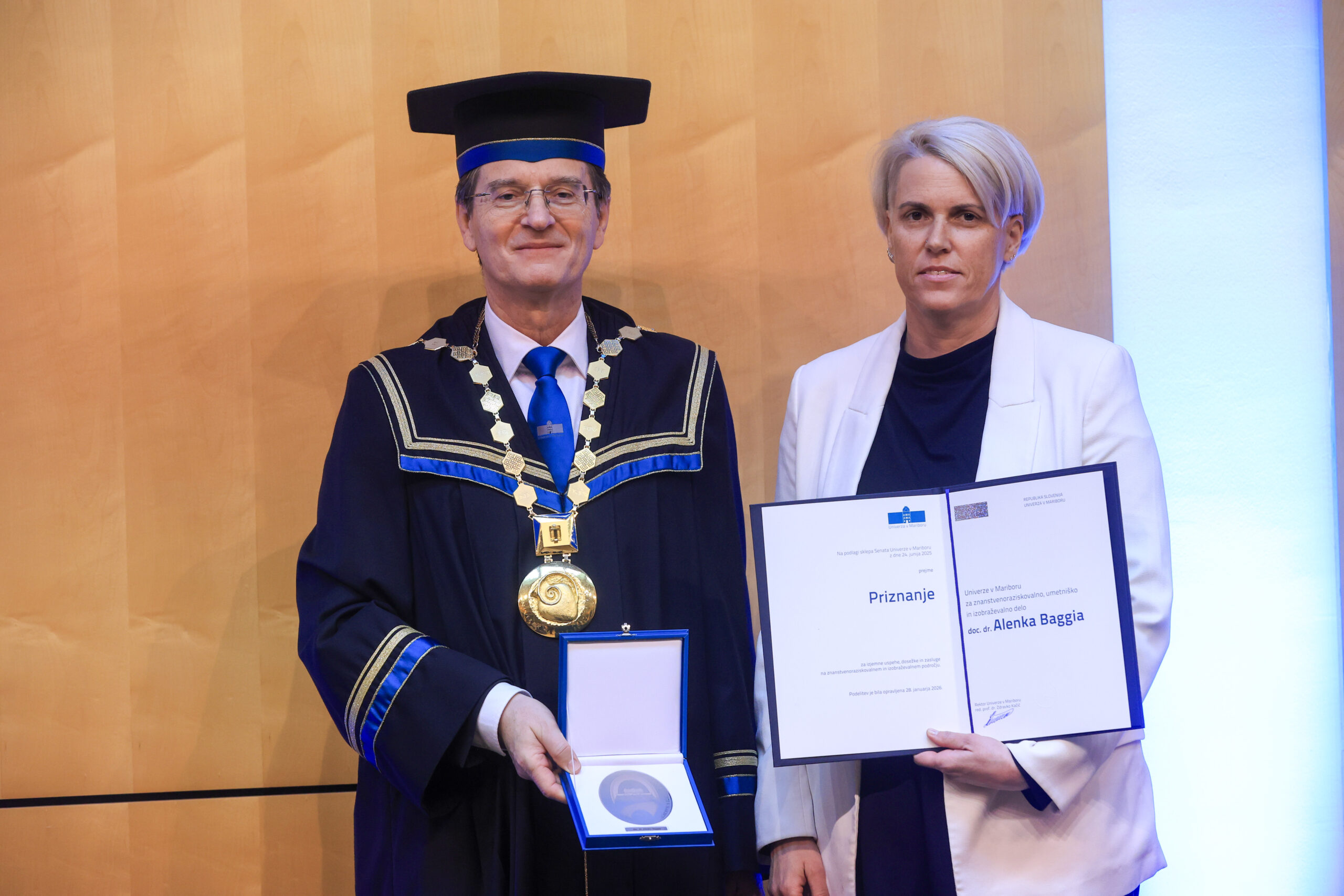 Priznanje Univerze v Mariboru za znanstvenoraziskovalno delo, umetniško in izobraževalno delo je prejela doc. dr. Alenka Baggia. Priznanje je bilo podeljeno za izjemne uspehe, dosežke in zasluge na znanstvenoraziskovalnem področju in izobraževalnem področju.